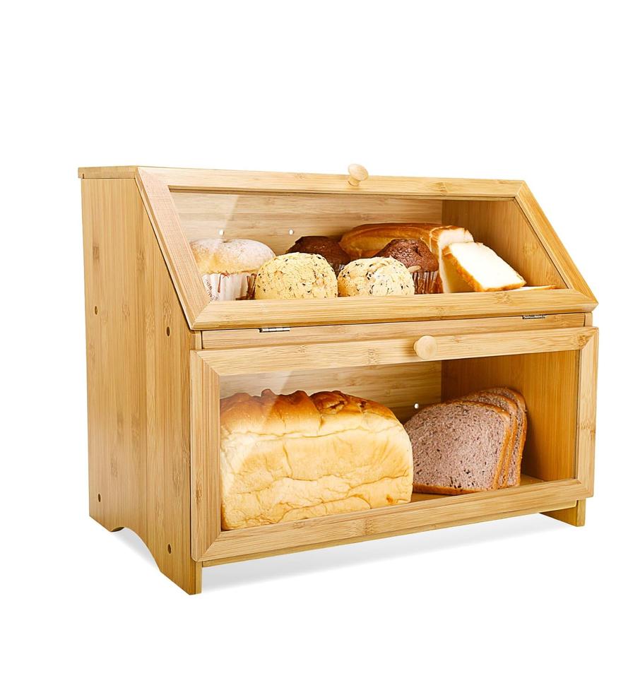 Double Layer Large Bread Box for Kitchen Counter, Wooden Large Capacity Bread Storage Bin (Natural Bamboo)