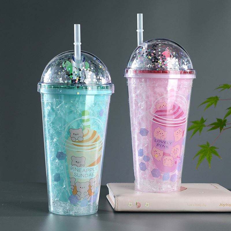 Double-Layer Plastic Ice Led Luminous Light With Straw Cartoon Portable Student Water Cup Micro Landscape Ins Style