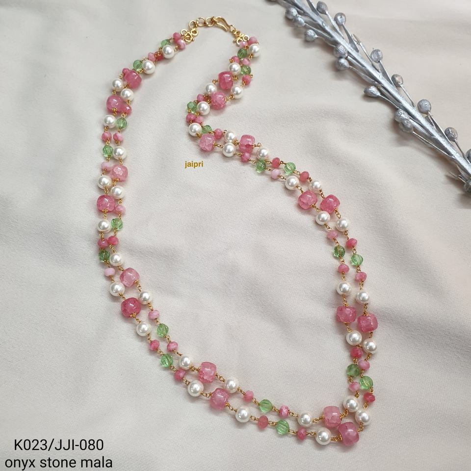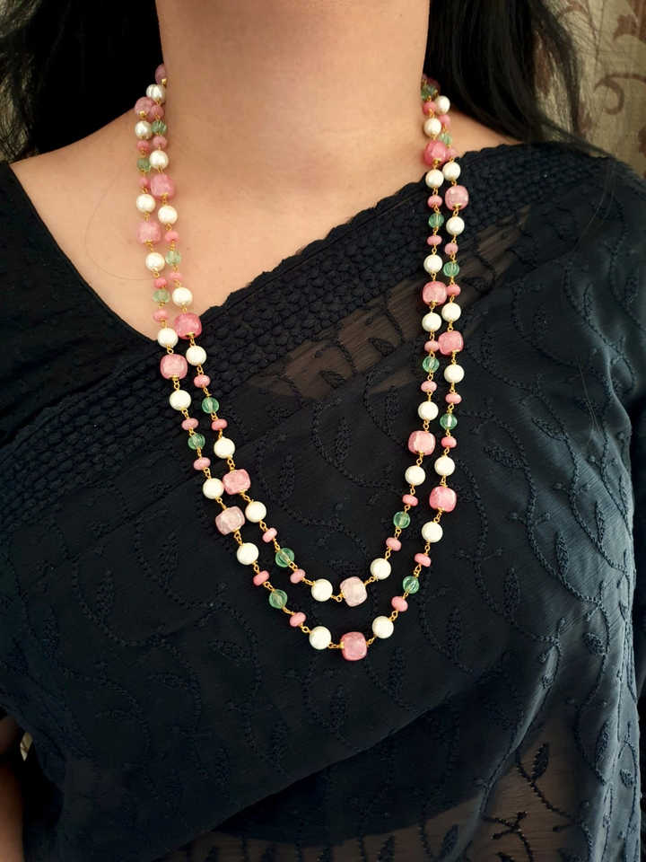 Double Layered Pink Stone Beads Long Mala Fashion Necklaces with Pearl Accents