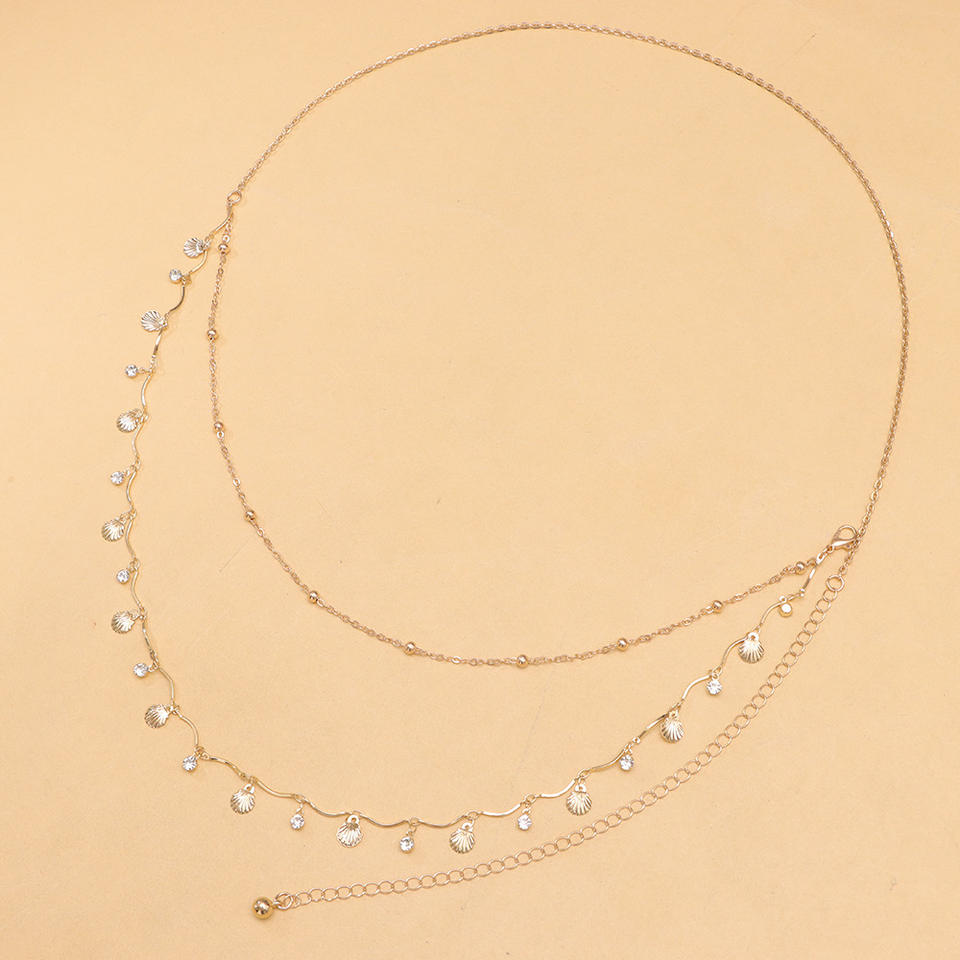 color:Double-layered shell rhinestone waist chain in gold