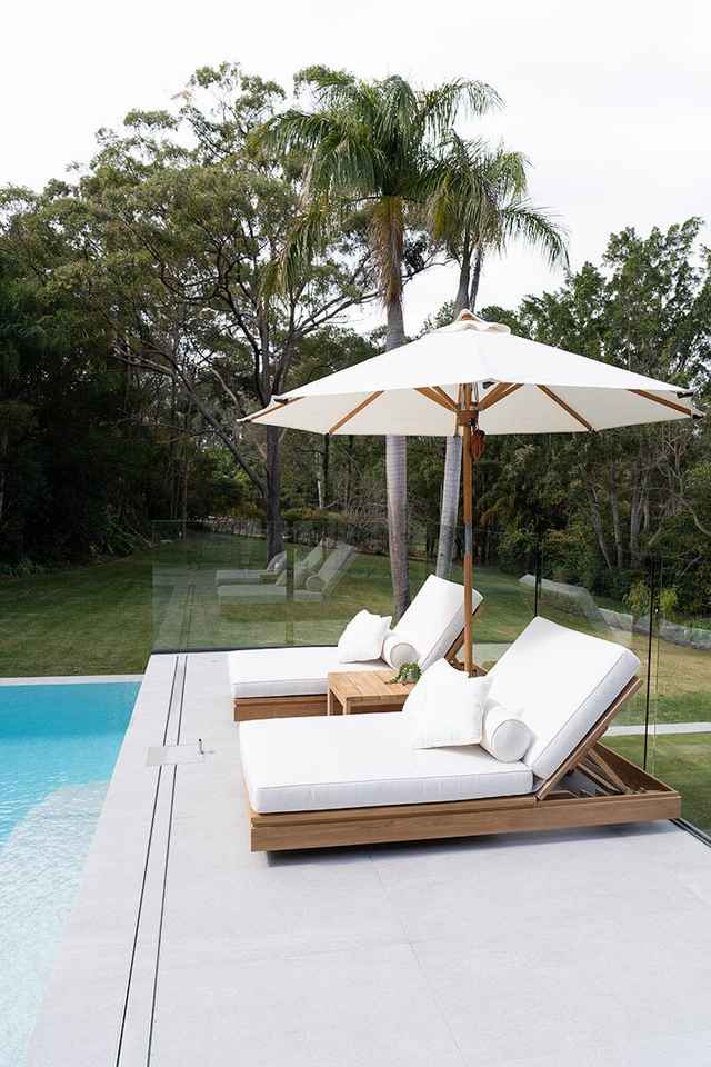 Double Lounger with Solid Teak Base and Plush white Cushions Modern Minimalist Outdoor poolside Relaxation Furniture