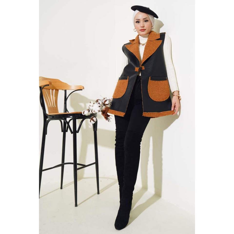 Double Pocket Genuine Leather Vest for Women Formal Woven Fabric with Embroidery Available Black Camel for Spring Winter Seasons