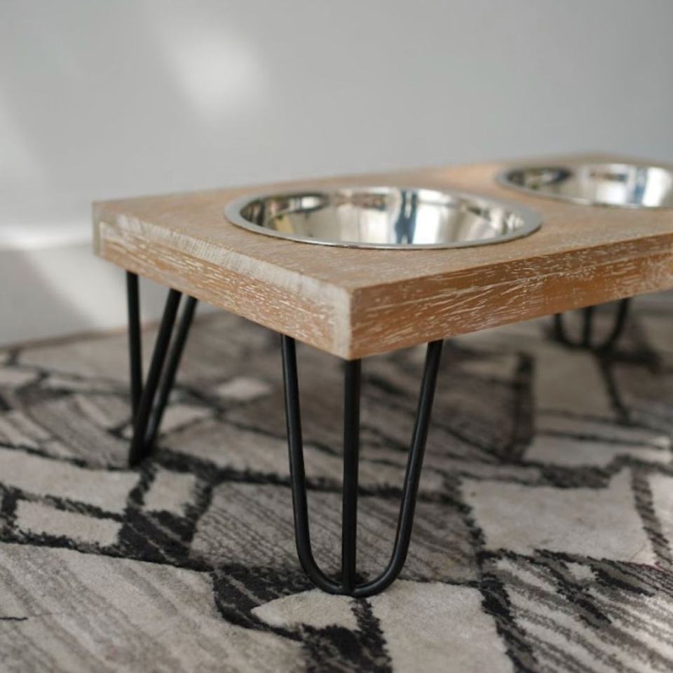 Double Rectangular Stainless Steel Pet Feeding Bowl With Wooden Top and Black Metal Frame for Dog & Cat Food and Water Serving
