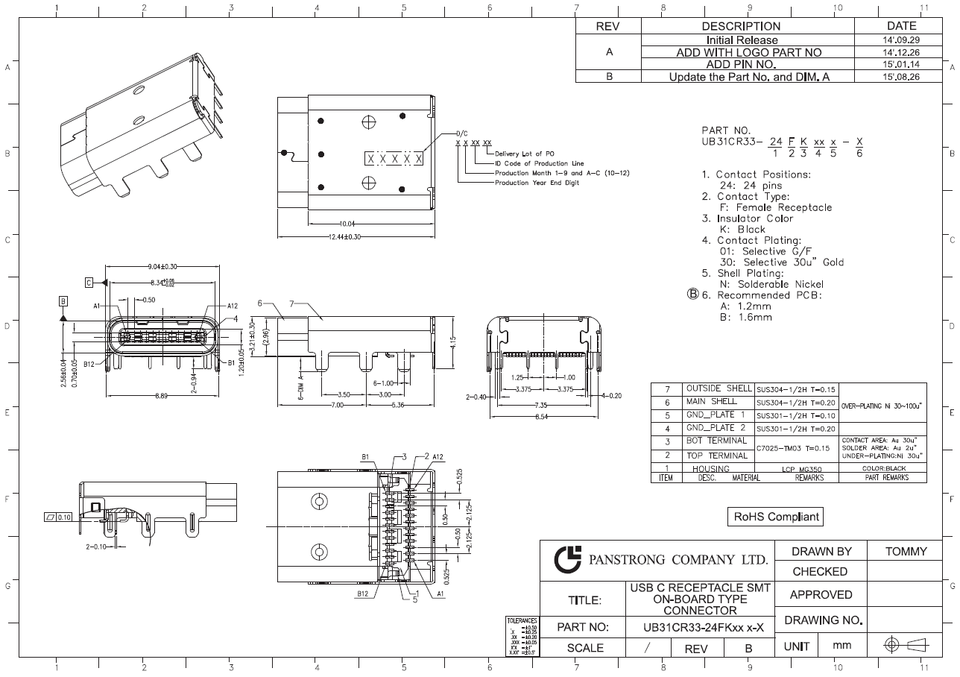 Double Smt Pins Right Angle For Pcb Black Insulator Shell Pin For Pcb Usb 3.1 C Type Connector 24Pin Socket