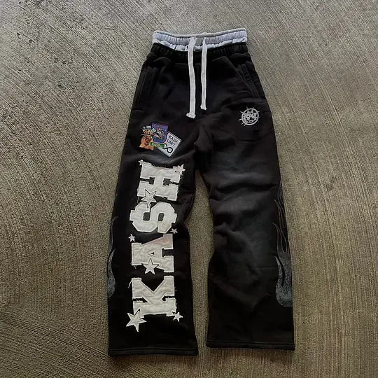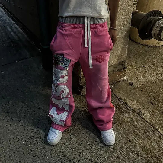 Double Waist Distress Applique DTG Print Cotton Heavy Weight French Terry Mens Jogger Pants Vintage Sun Faded Flare Sweat Pant