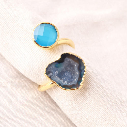 Double Gemstone Ring Dainty Round Shape Chalcedony with Crystal Geode Druzy Ring Brass Gold Plated Adjustable Statement Rings
