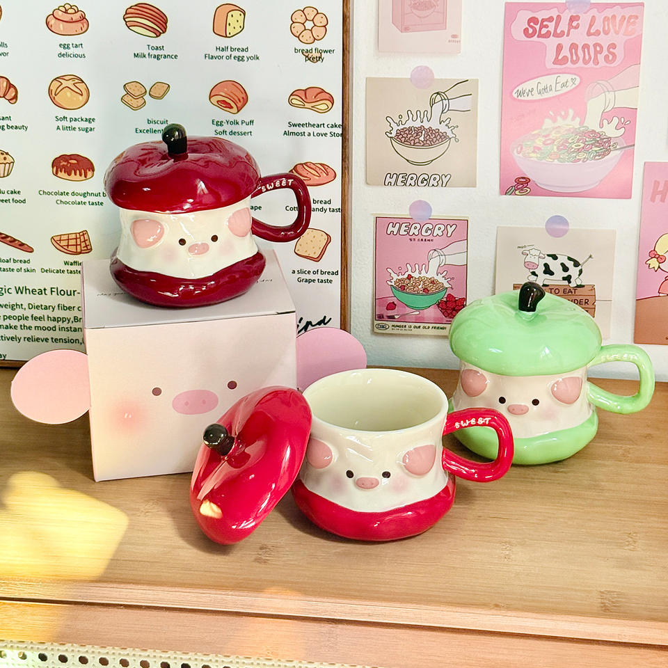 Dragon Nest Cute Apple Pig Ceramic Mug With Lid 301-400ml Reusable Gift For Birthday Christmas
