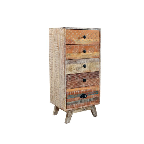 Drawer Chest With 5 Drawers In Solid Reclaimed Wood Featuring Carved Design White Distressed Finish And MDF Back
