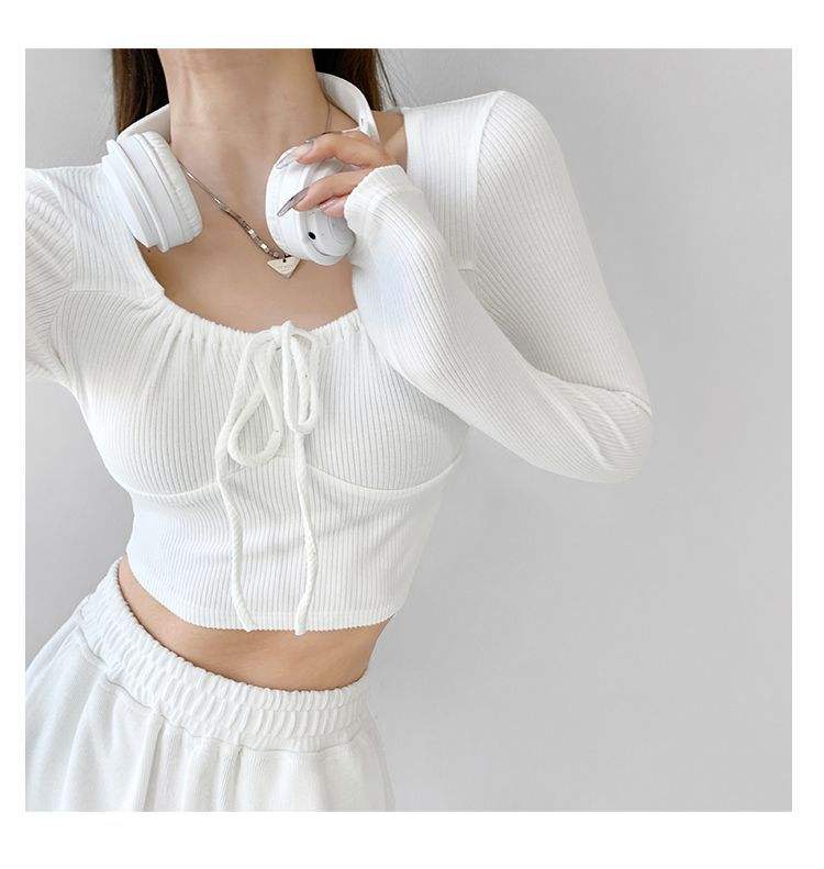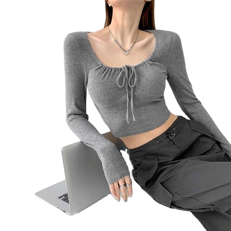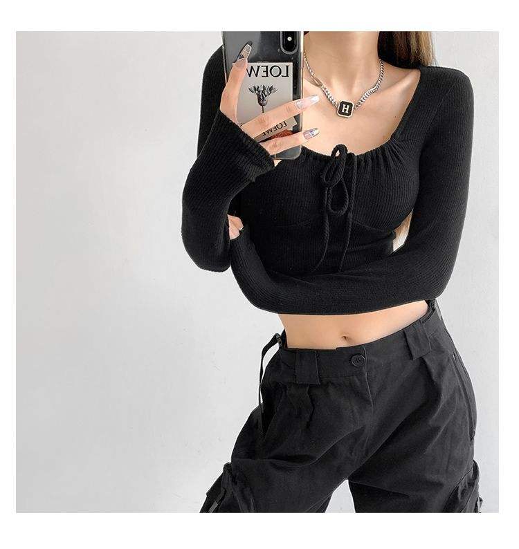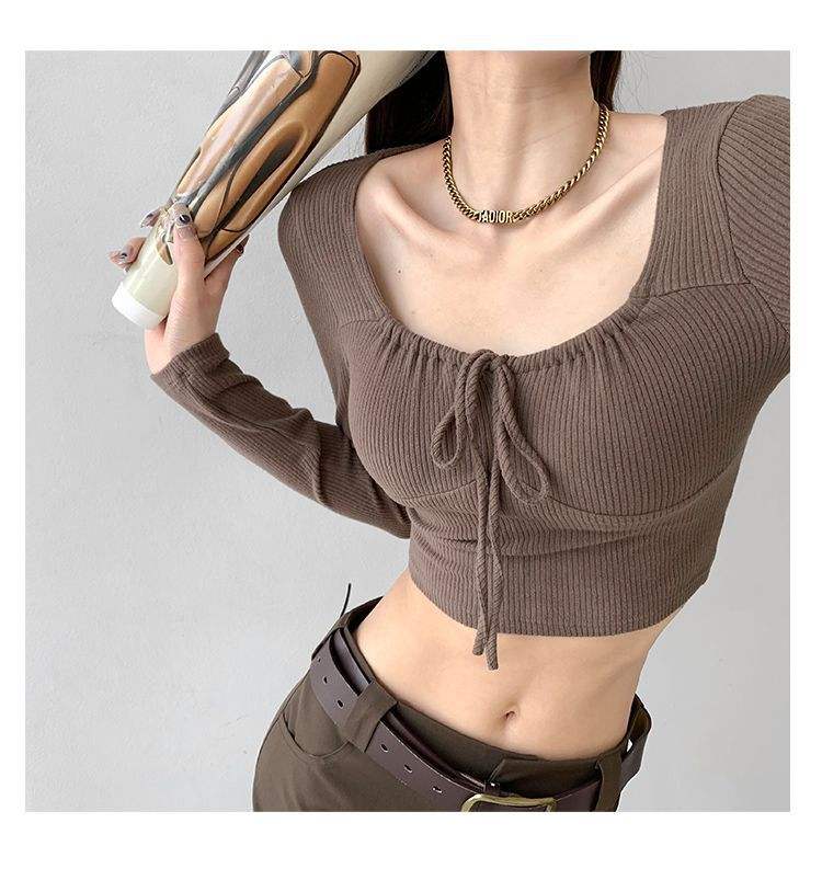 Drawstring Crop Tops Women Spring Autumn New Style Slim Square Neck Long Sleeve T-shirt for Teen Girls Fashion Wear
