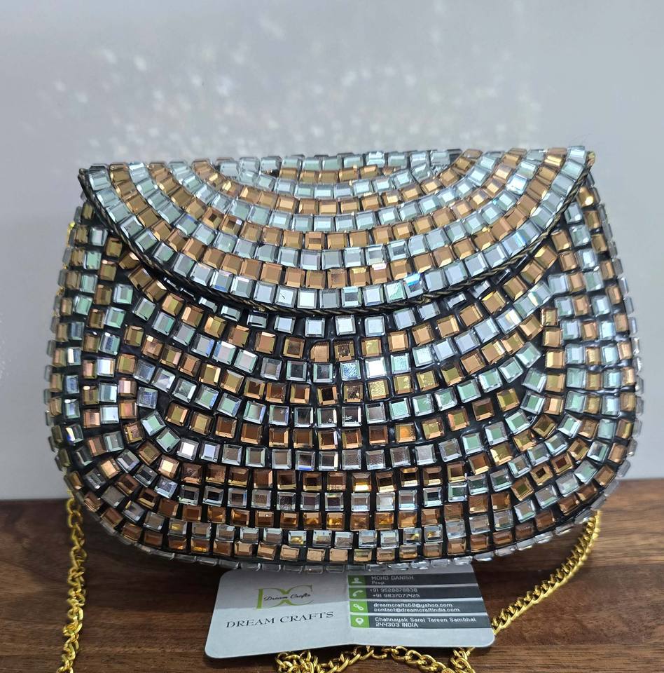 Dream Crafts India DCCB54 Designer Evening Clutch Mosaic Embellished Half-Moon Pattern Crystal Metal Kundan Mirror Work Ladies