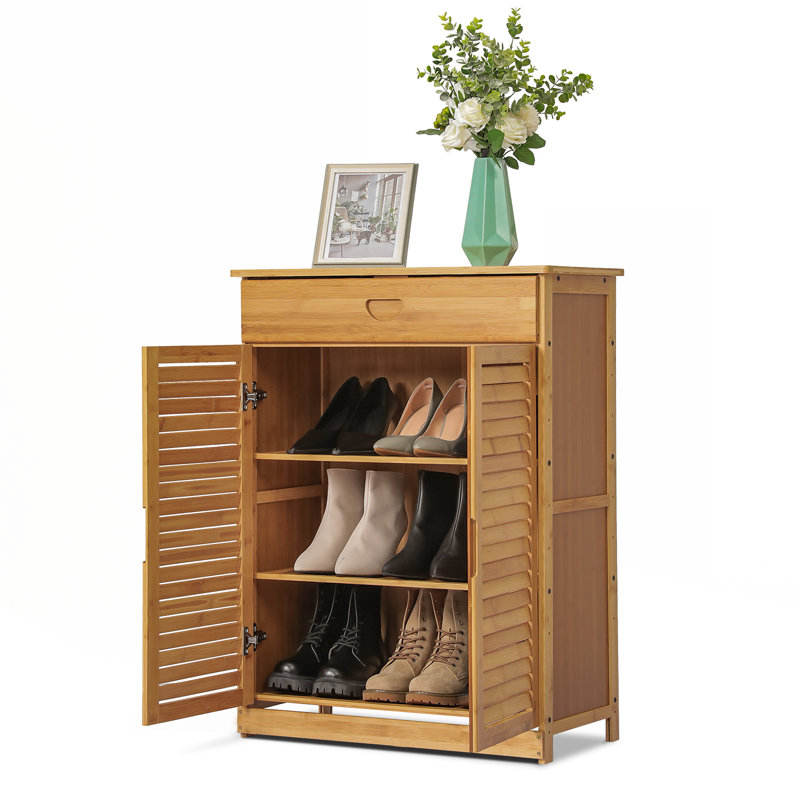 DreamCraft Modern 3 Tiers 1 Drawer Shoe Rack 9 Pairs Storage Stand Organizer Bamboo Cabinet Fabric Entryway Hallway Double