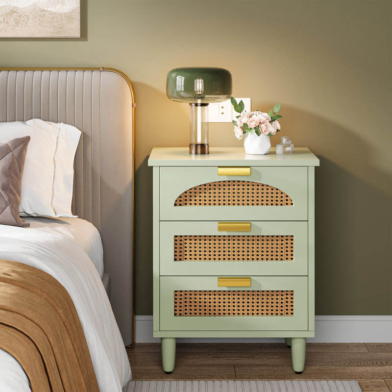 DreamCraft Modern European 3-Drawer Rattan Nightstand Green Foldable Side Table for Bedroom or Hospital Vietnam 2PK (Set of 2)