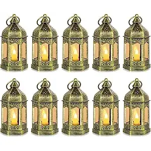 DreamCraft Set of 10 Mini Gold Vintage Hanging Lanterns with Flickering LED Candles Vietnam for Halloween Christmas Weddings