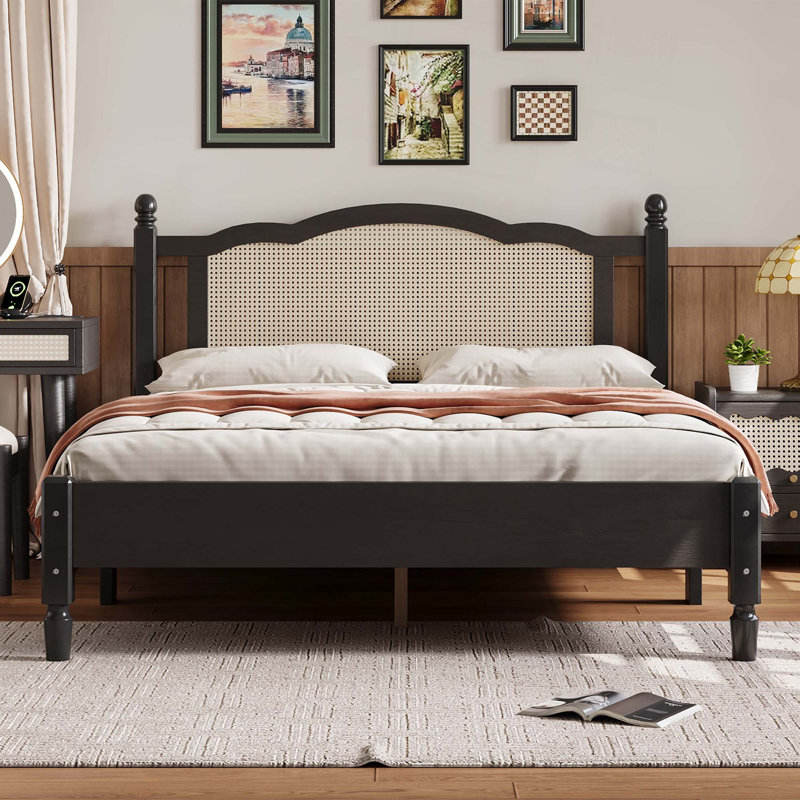 DreamCraft Vintage Wooden Platform Bed with Natural Rattan Headboard Bed Frame and Wooden Slat Support Vietnam Origin