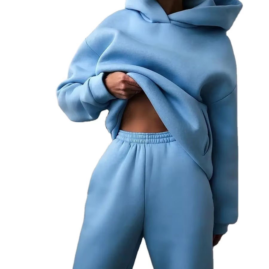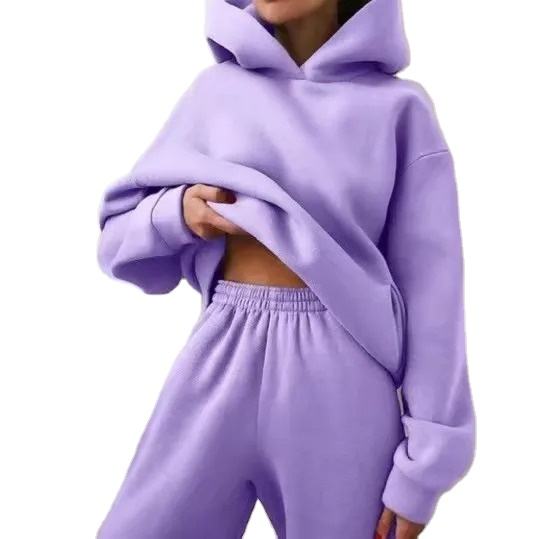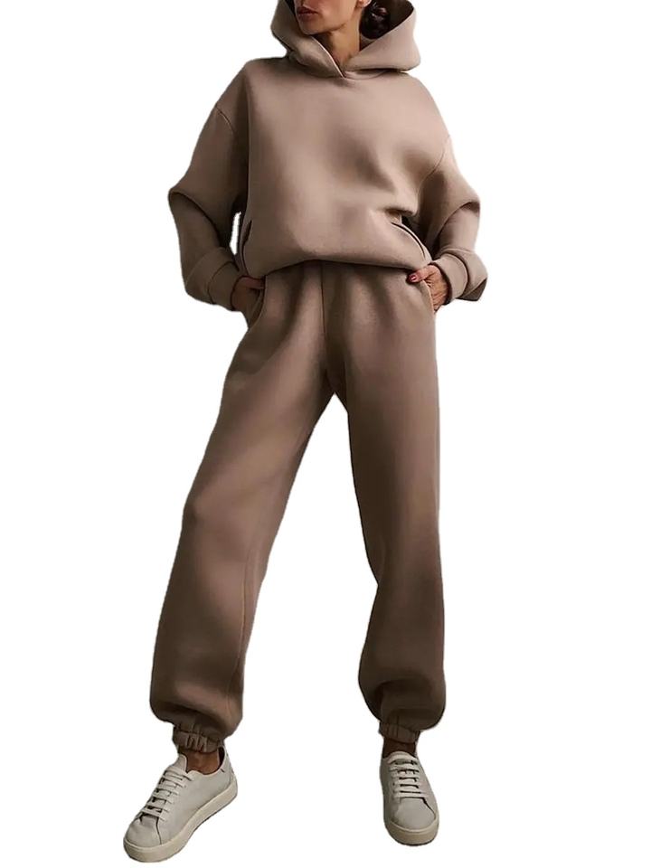 Oversized Drop Shoulder Casual 2-Piece Set Winter Sweatshirt Joggers Pants Solid Lace Patches Canvas Washed