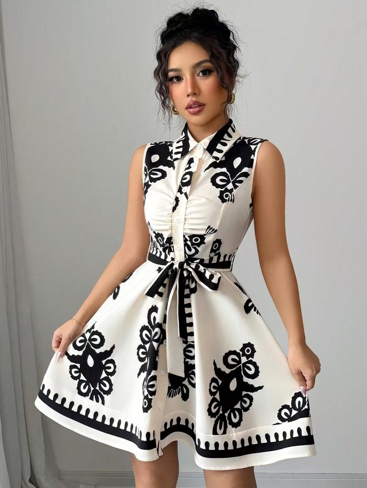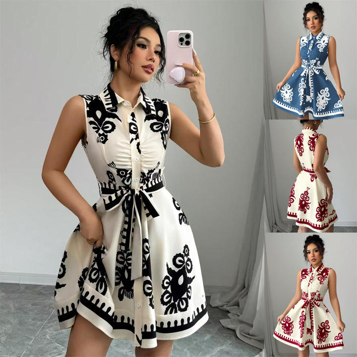 Dropshipping Shopify 2026 Womens Sleeveless Floral Print Dress Tie Waist A Line Shirt Collar Elegant Midi Dress For Summer