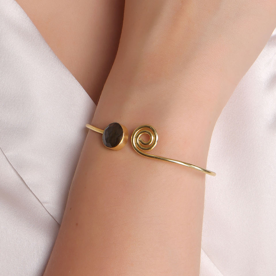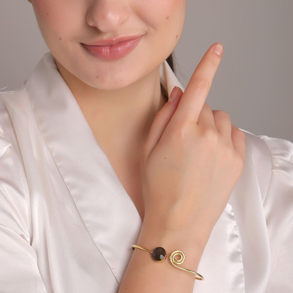Dua Labradorite Grey 18K Gold Plated Bezel Setting Cuff Bracelet | Handmade Brass Bangle Women | Wedding Wear Jaipur India