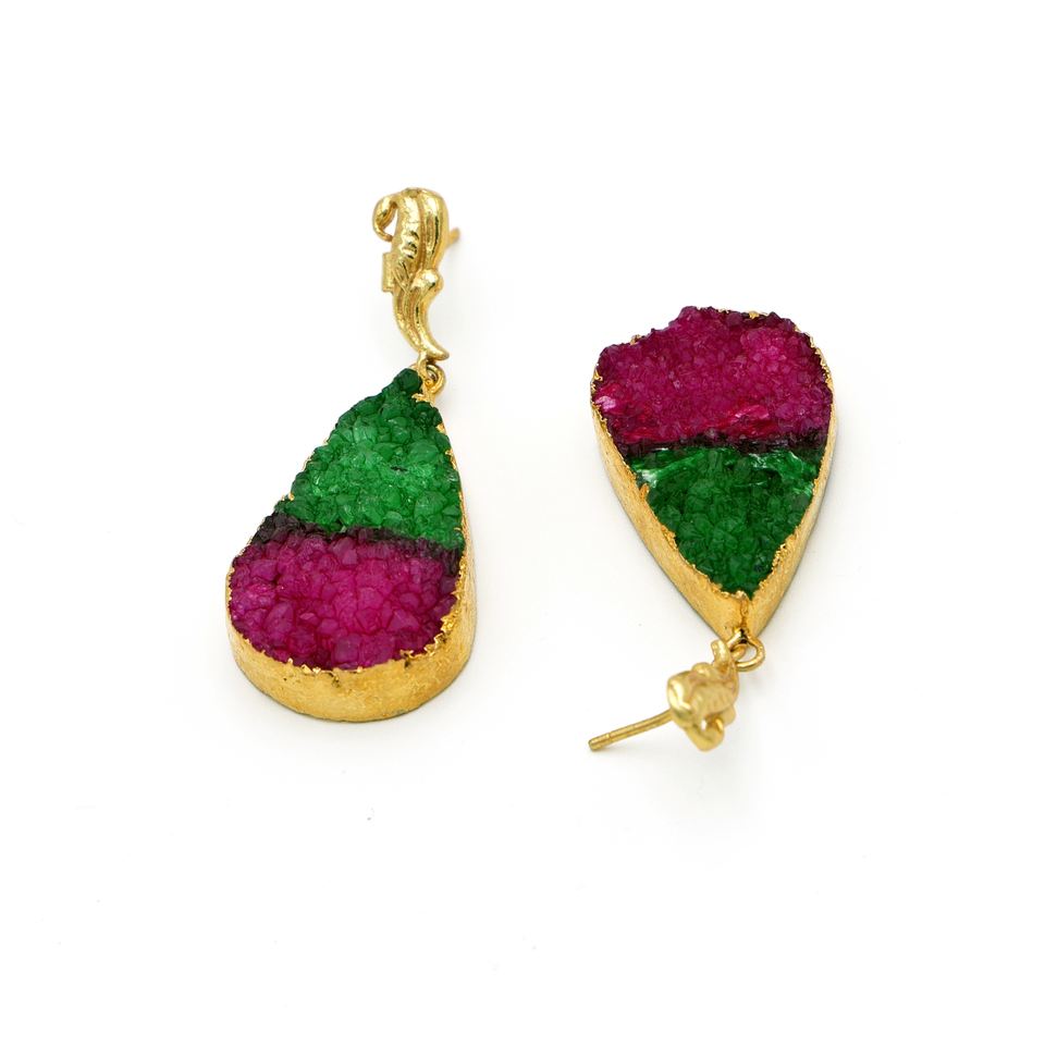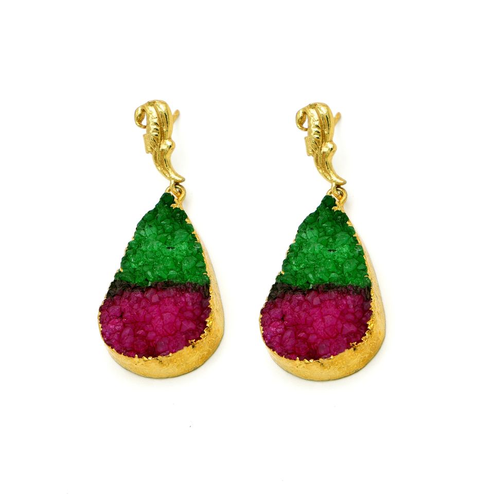 Dua Trendy Green Pink Drusy Drop Earrings Handcrafted Brass 18K Gold Plated Wedding Jewelry