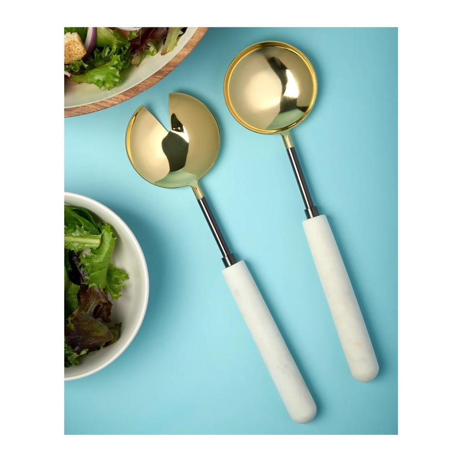 Dual Tone Golden & White Salad Serving Spoon Solid Polish Cutlery Set Flatware Bone Inlay Mirrored Steel Silver Salad Server