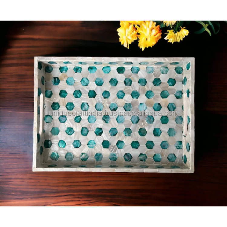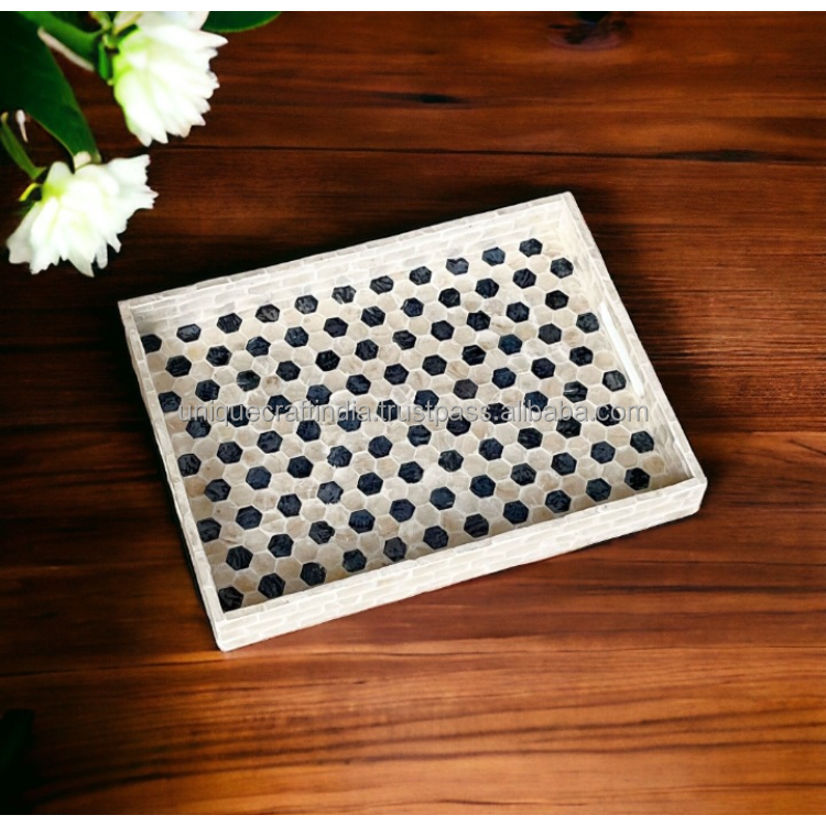 Dual Tone Rectangular Mother of Pearl Inlay Tray Handmade Wooden Serving Tray with Leafy Patterns for Luxury Dining Decor Gift