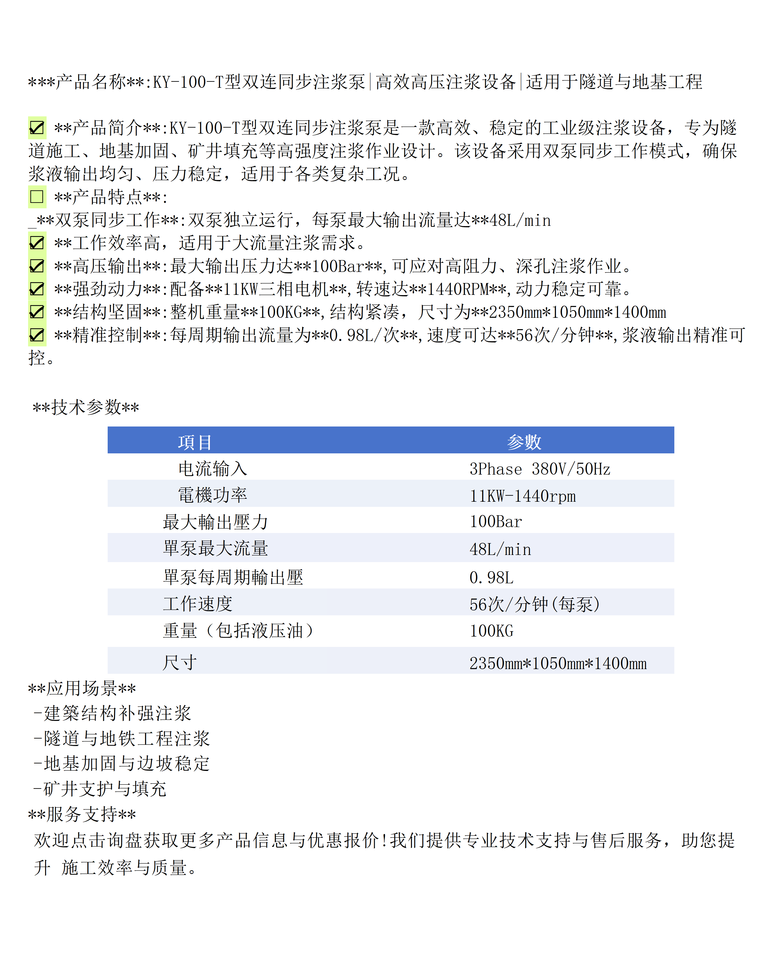 Dual-pump synchronous grouting machine, maximum pressure 100 bar, 11 kW motor, 48 liters per minute recovery capacity