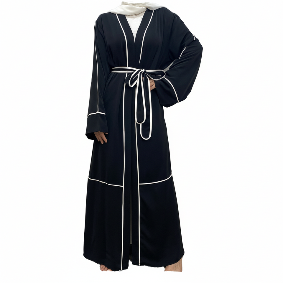 Dubai Women's Modest Polyester Open Abaya on Sale Black and White with Matching Belt New Daily Fashion 2023