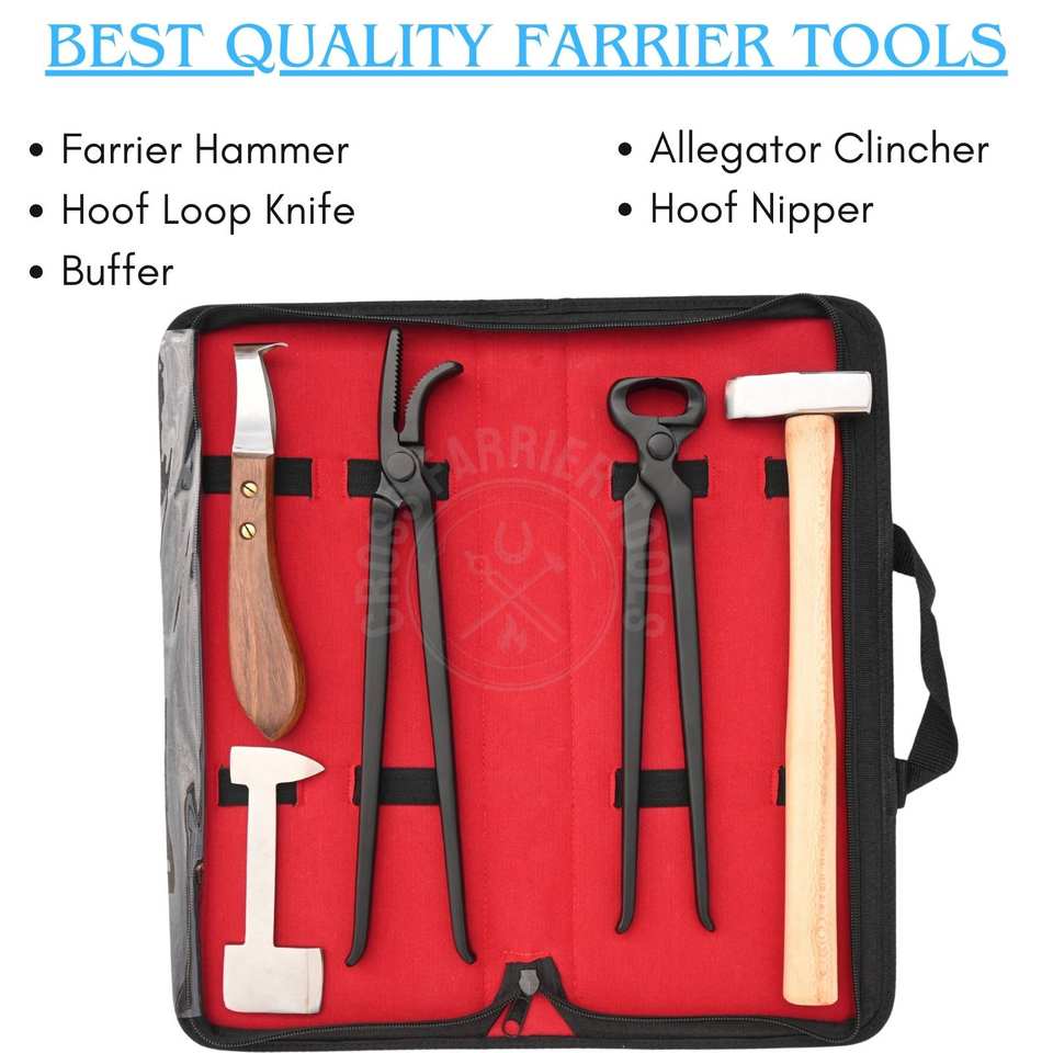 Durable Farrier Tools Kit for Horse Hoof Care with Black Hoof Nipper Loop Knife Farrier Hammer Alligator Clincher and Buffer