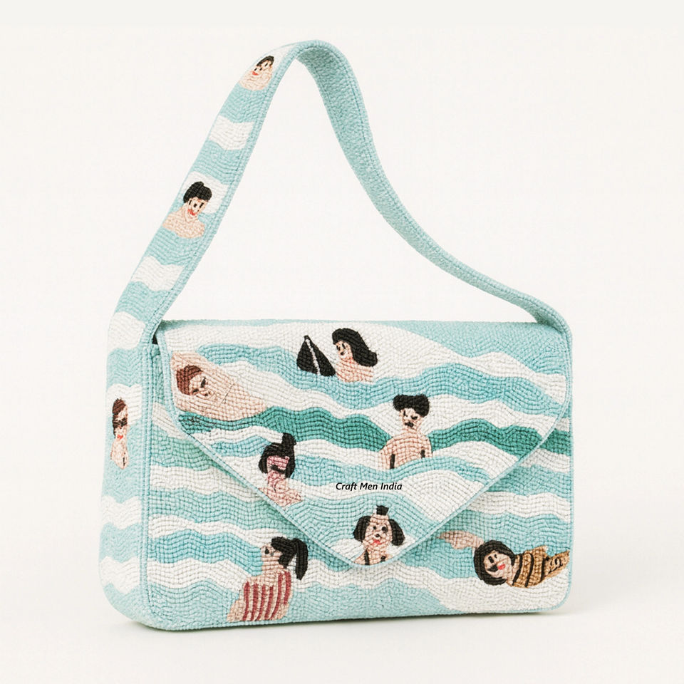 Durable Square Beaded Shoulder Bag with Satin Lining Pearl Embroidery Magnetic Closure-Lightweight & Portable Fashion Handbag