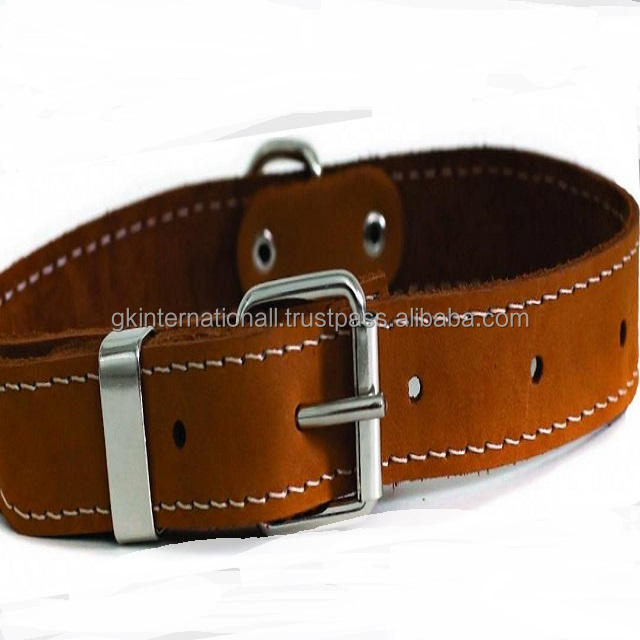 Durable White Stitching Heavy Duty Tan Brown Leather Dog Collar for All Size Pets With Stainless Roller Pin Buckle D Ring & Loop