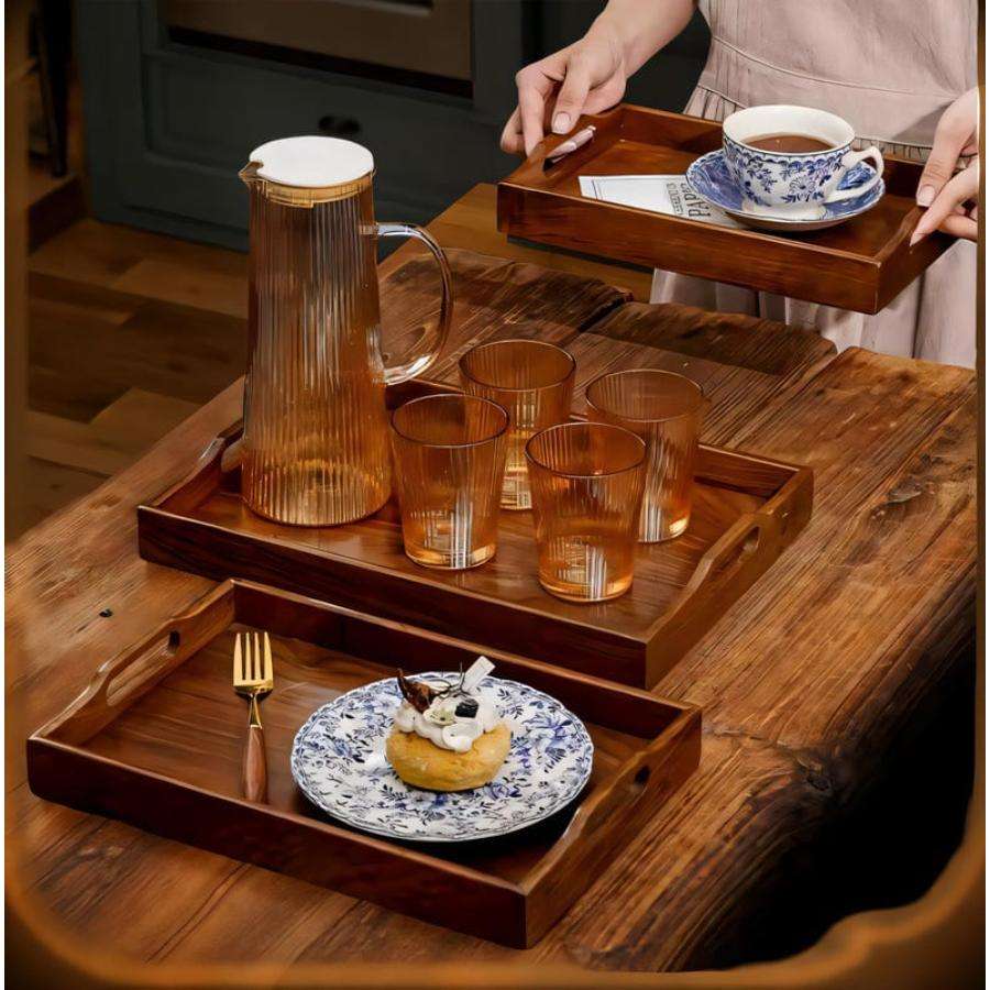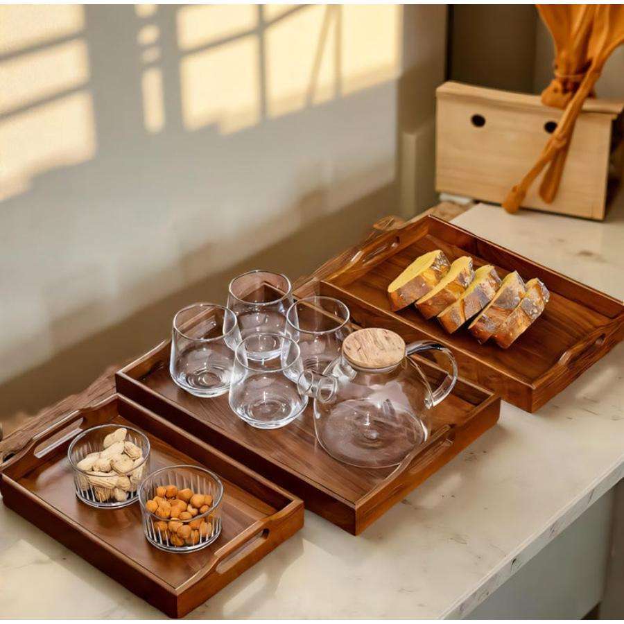 Durable Wooden Trays Set of 3 Nesting Platter And Serving Dish Set Breakfast Lunch Dinner Serve Rectangular Trays With Handles
