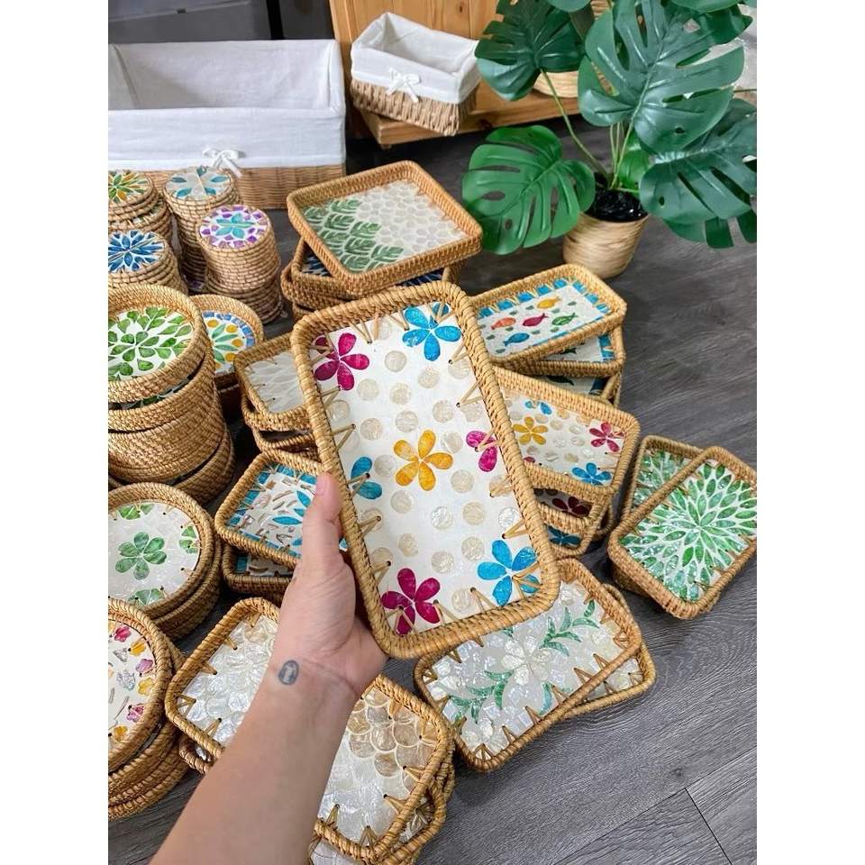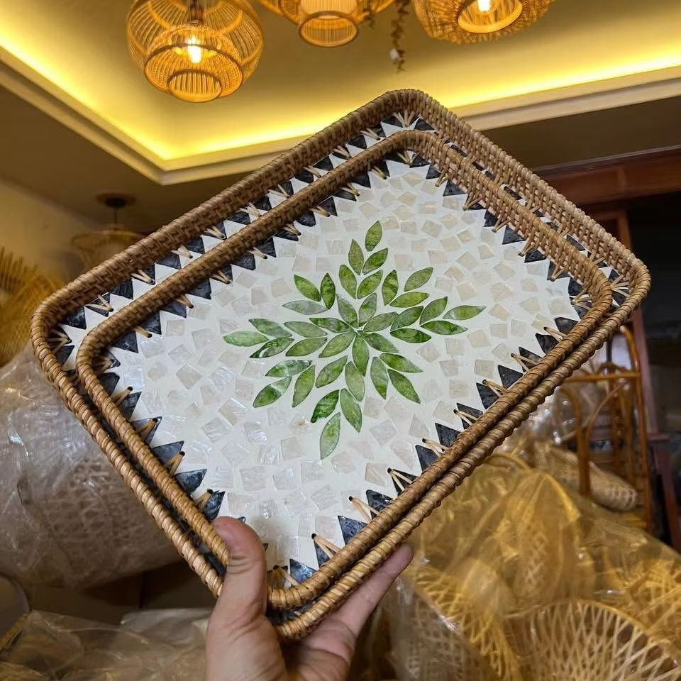 Durable natural rattan mother of pearl tray Vietnam for breakfast in bed serving or stylish wall hanging art in bohemian