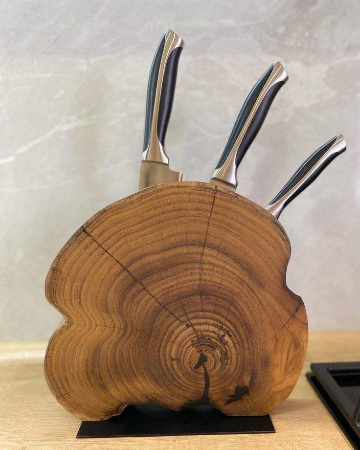 Durable wooden knife holder featuring compact design and deep slots to accommodate chef knives utility knives and more