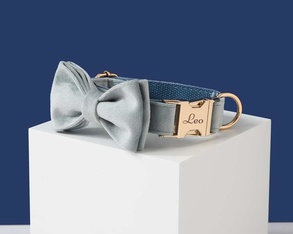 Dusty Blue Bow Tie Set, Collar And Lead, Large Small Puppy, Thick Veet Collar,Wedding Collar, Dog Lover Gift UK