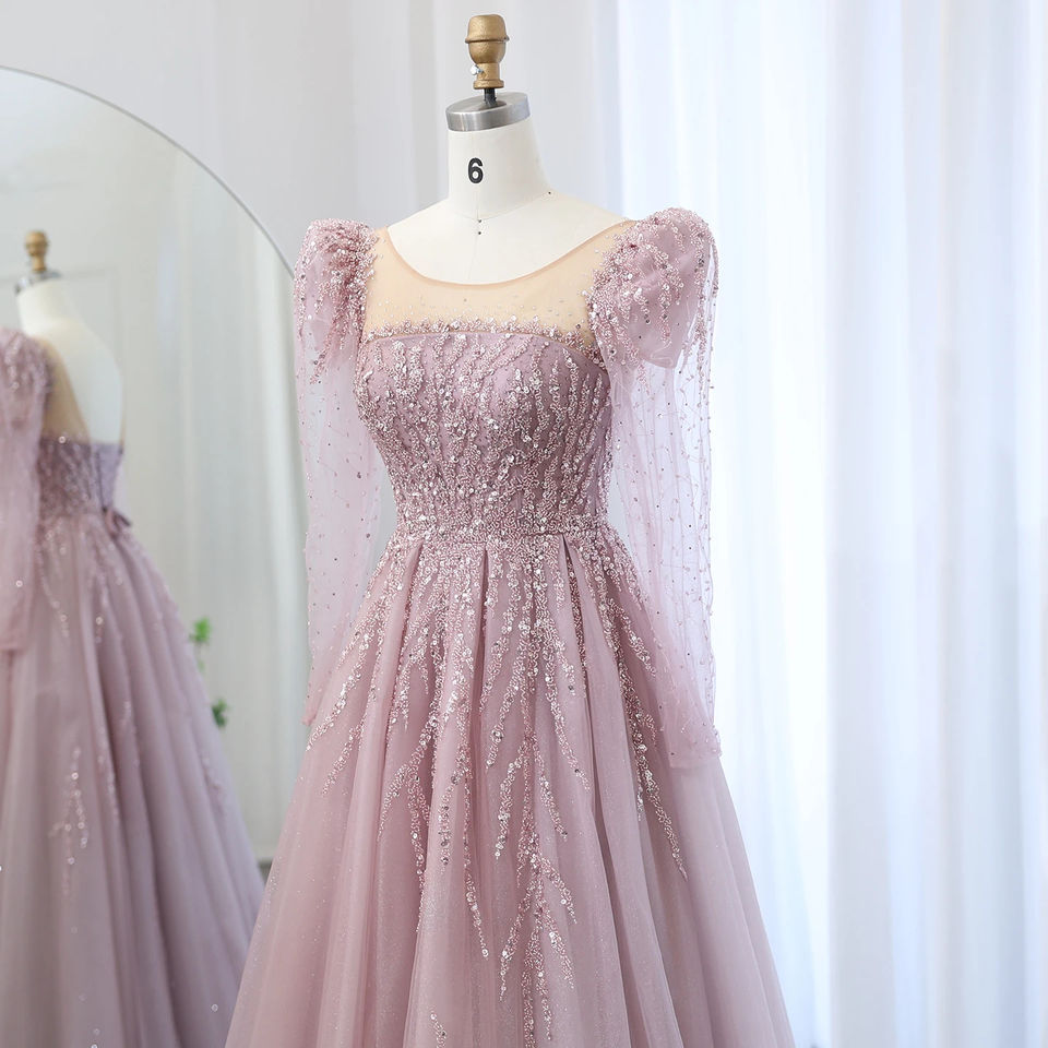 Dusty Pink Long Sleeves Dubai Luxury 3D Sequined Evening Dresses for Women Wedding Party Arabic Muslim Formal Prom SZ453-1