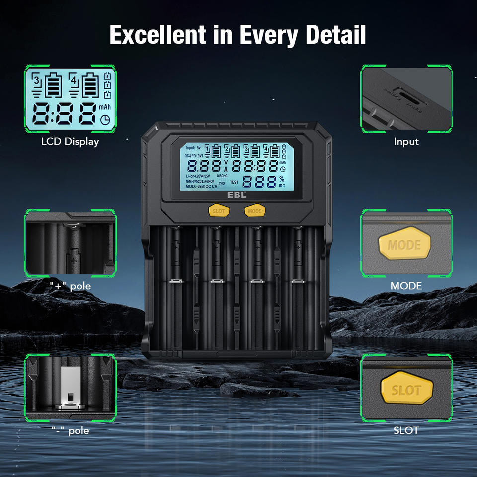 EBL 18650 Mobile Smart Lithium AA Battery Test Charger for 3.6V 3.7V Li-ion 3.2V LiFePO4 1.2V Ni-MH Rechargeable Batteries