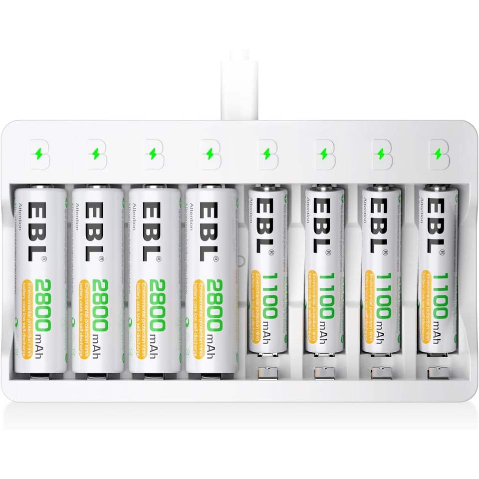EBL 8-Bay Individual AA/AAA Battery Charger Fast Charging with LCD/LED Display Rechargeable 4 AAA 1100mAh 4 AA 2800mAh Batteries