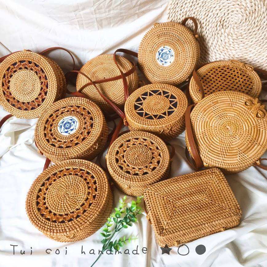 ECO FRIENDLY ROUND HANDBAG: HANDMADE VIETNAM FASHION TOTE RATTAN BAG FOR SUMMER TRAVEL USE.