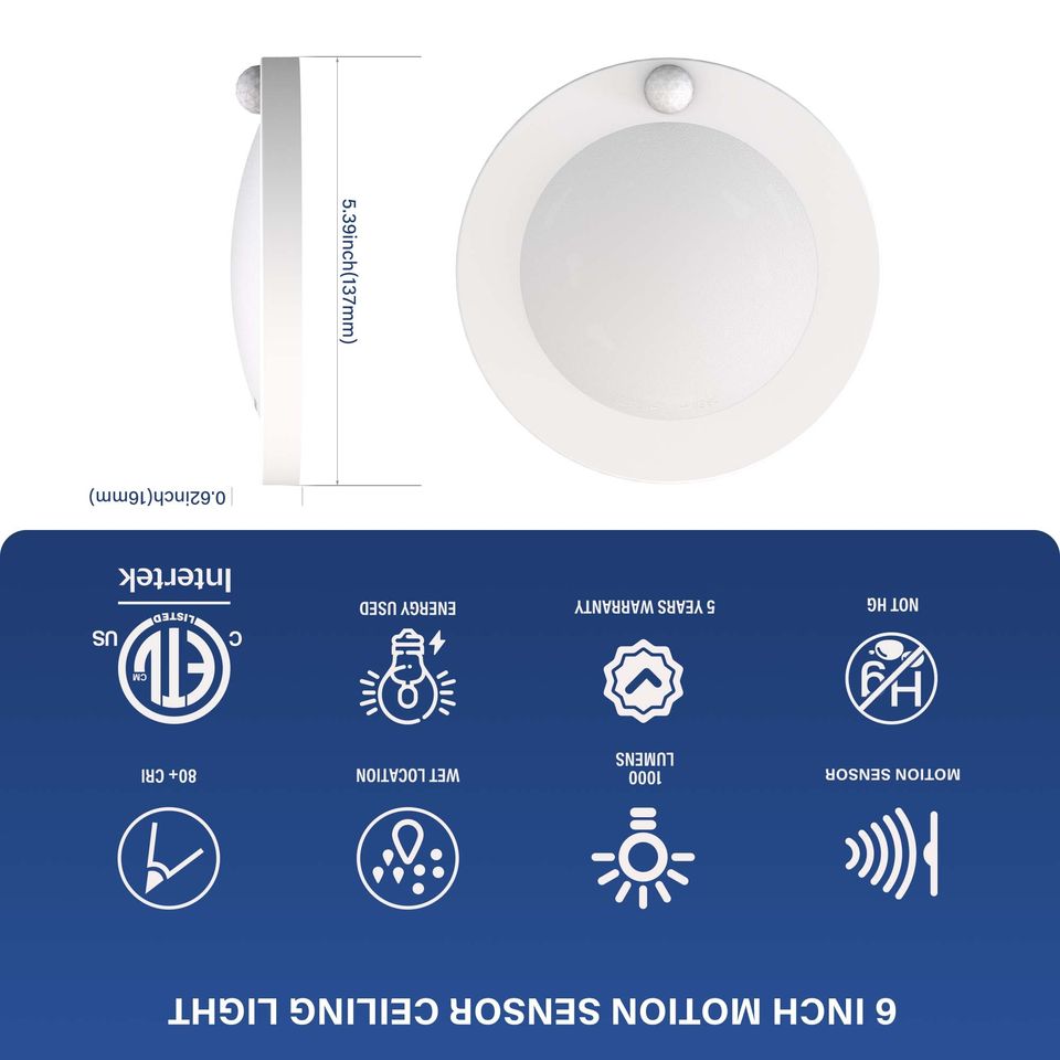 ETL 6" Flush Mount Ceiling PIR Motion Sensing LED Closet Light Low Profile Wet Location 120VAC