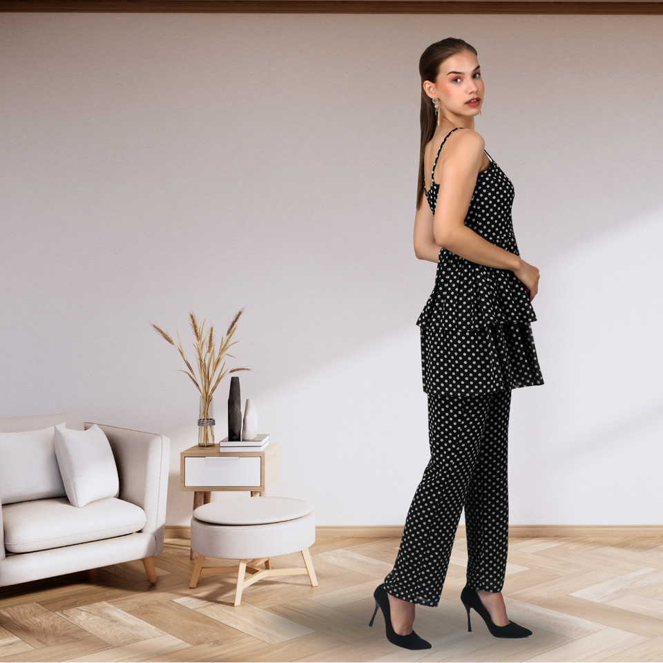 Luxury Designer Black Polka Dot Co Ord Set for Women Trending Party Wear Spaghetti Strap Peplum Top and Pants Premium Look
