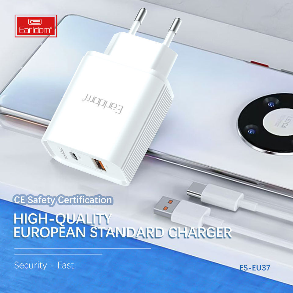 Earldom Super Fast PD Type USB-C Wall Charger Dual USB-A/C Ports 5V/3A Travel Adapter for Samsung Mobile Phones OTP Made Gan