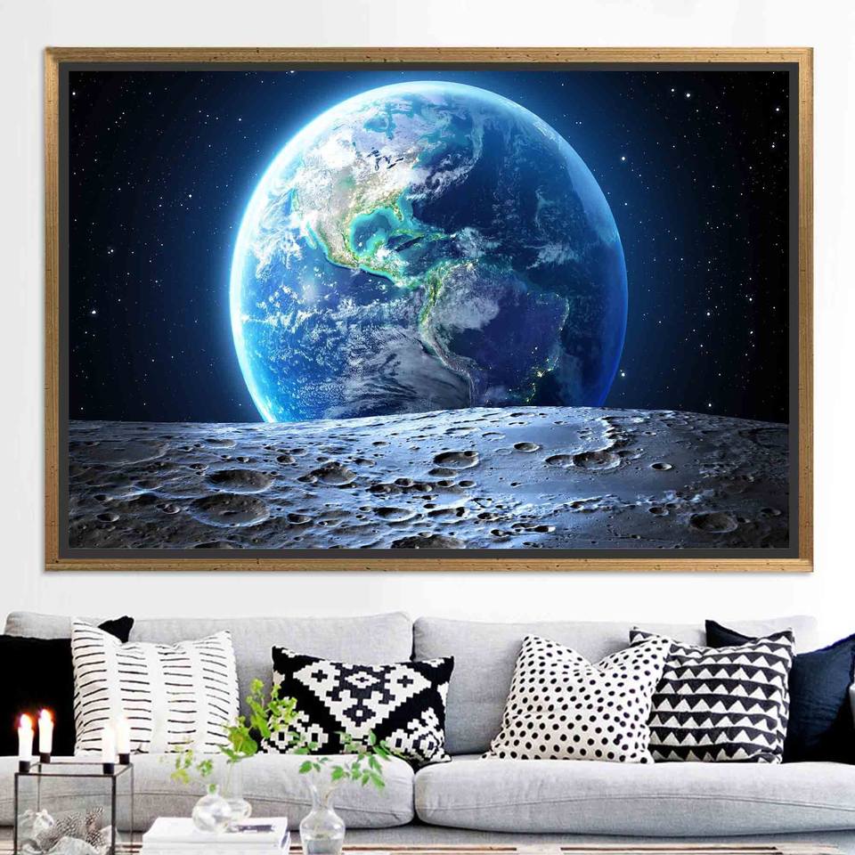 Earth & Moon Canvas Print: Space Landscape Wall Art,GOLD FRAMED CANVAS