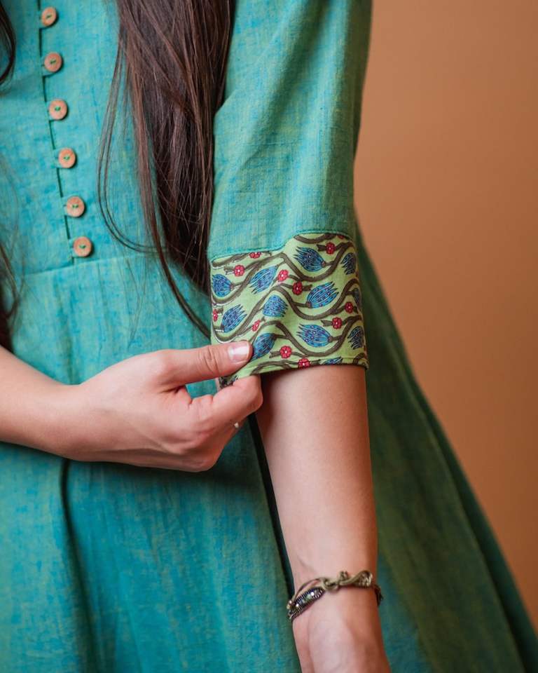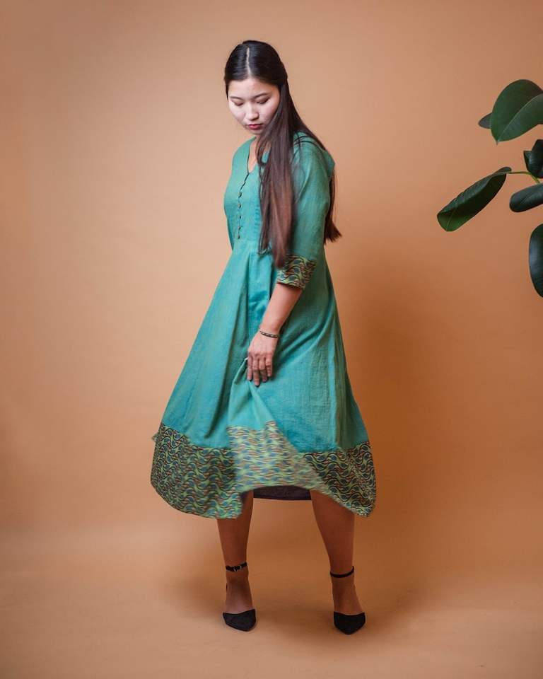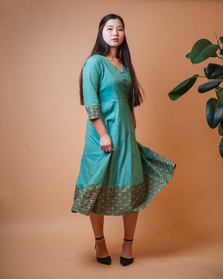 Ease Bohemian Hand Loom Pure Cotton Hand Block Printed Calf Length Dress Ethical Fashion