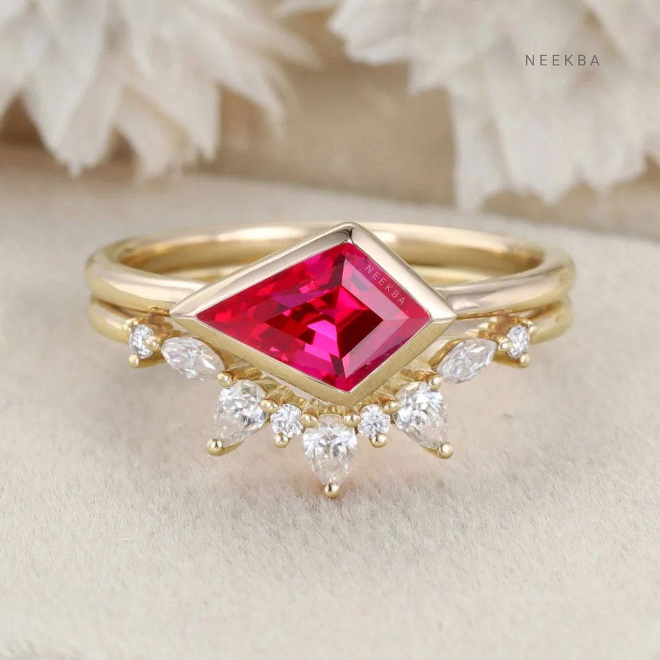 East West Bezel Set Kite Cut Ruby Engagement Ring Paired with Contour Moissanite Wedding Band, Handcrafted 925 Silver Bridal Set