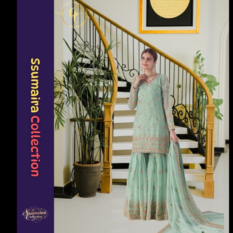 Eastern Ready to wear Flared Gharara Color Aquamarine 3 Pc Top Bottom & Dupatta Party Wear Trouser Fabric Chiffon Anarkali