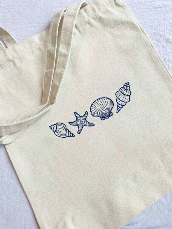 Eco-Friendly Cotton Canvas Tote Bag with Blue Ocean Shell and Starfish Print-Customizable Reusable Beach Style Shopping Bag