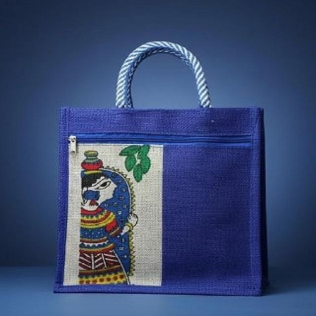 Eco-Friendly Cotton Handled Bag Madhubani Fish Decorative Print Natural Red Panel Traditional Style Wine Storage Beach Purple