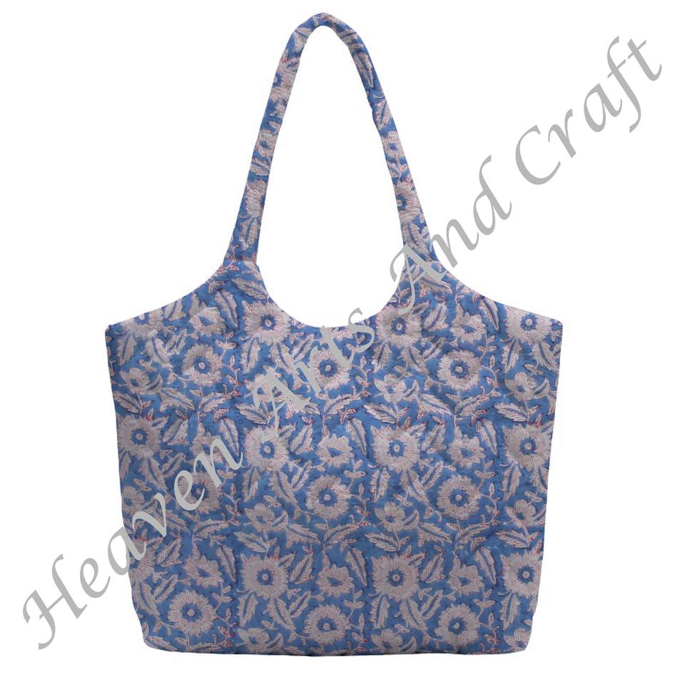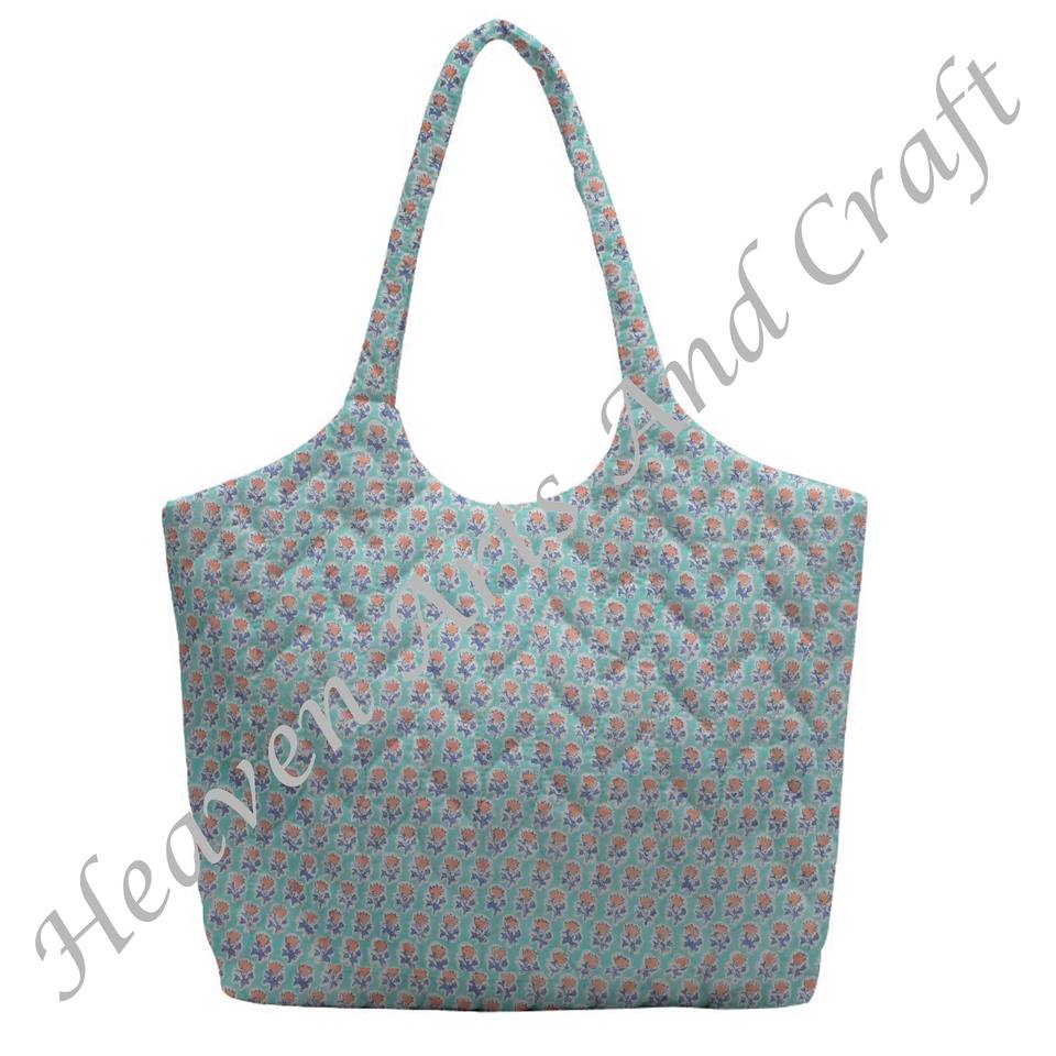 Eco-Friendly Cotton Puffer Quilted Tote Bag Handle Hand Block Printed Natural Base Indigo Floral Ladies Fashionable Shopping Bag
