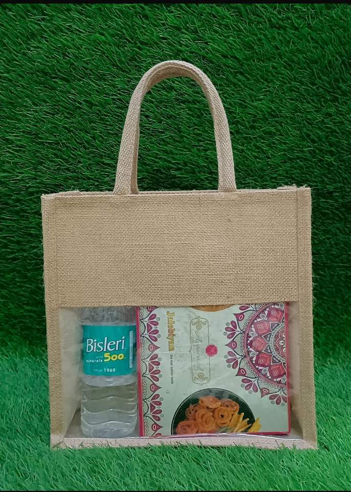 Eco-Friendly Custom Bulk Jute Shopping Bags Clear PVC Window & Delicate Lace Trim Clear Hamper for Corporate Return Gifts