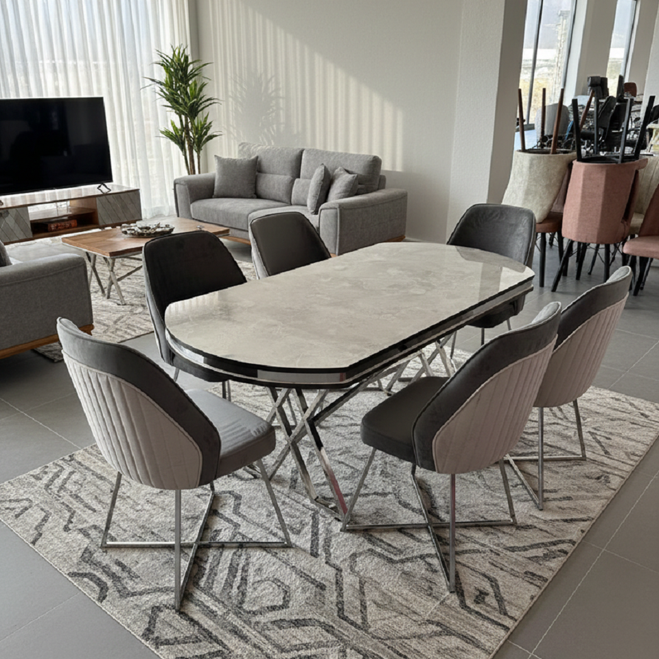 Eco-Friendly Dining Table Set 6 Chairs Handmade Modern Extendable Tempered Glass Top Metal Legs Chipboard Construction Durable