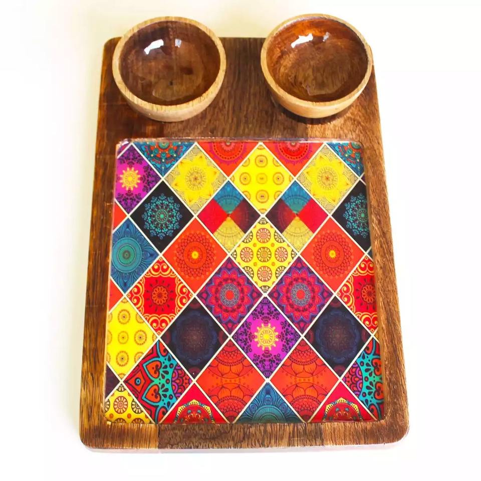 Eco Friendly Durable Handcrafted Decorative for Wood Tray Set Traditional Enamel Printed Base Two Wooden Bowls Ramadan Wedding